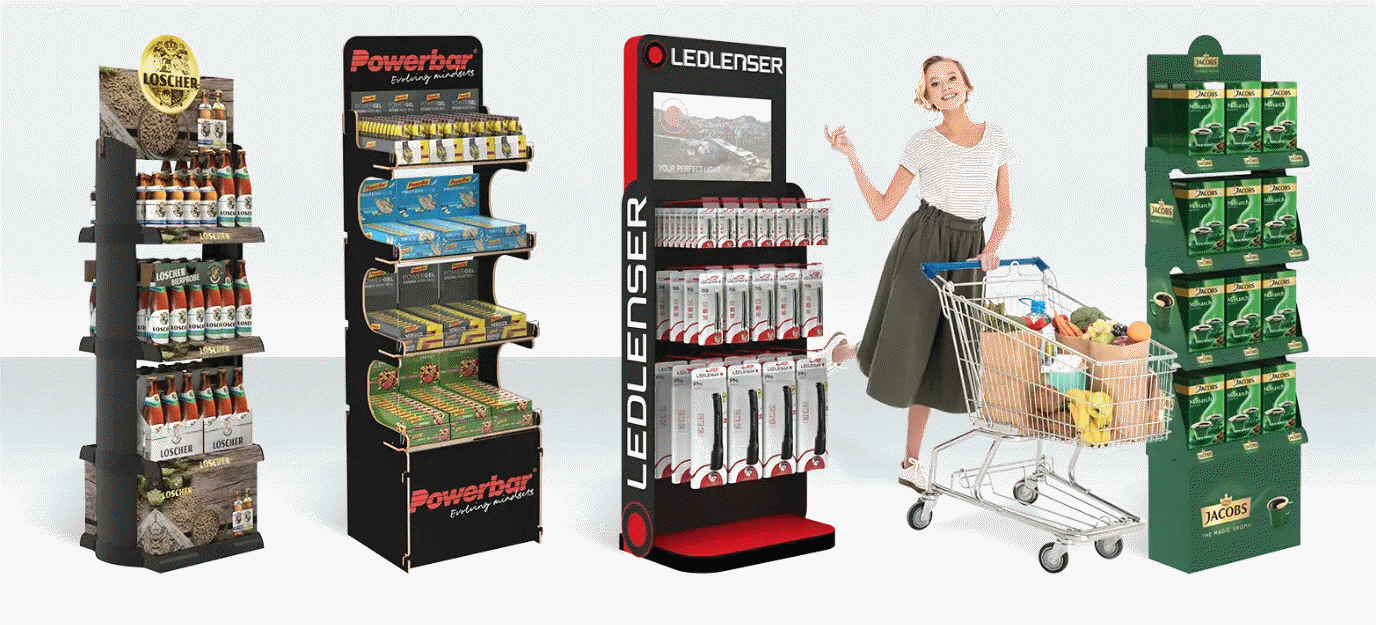 Wir fertigen Regaldisplays aus Holz, Kunststoff, Metall oder Pappe, jeweils passend zur gewünschten Einsatzdauer und Produktkategorie: